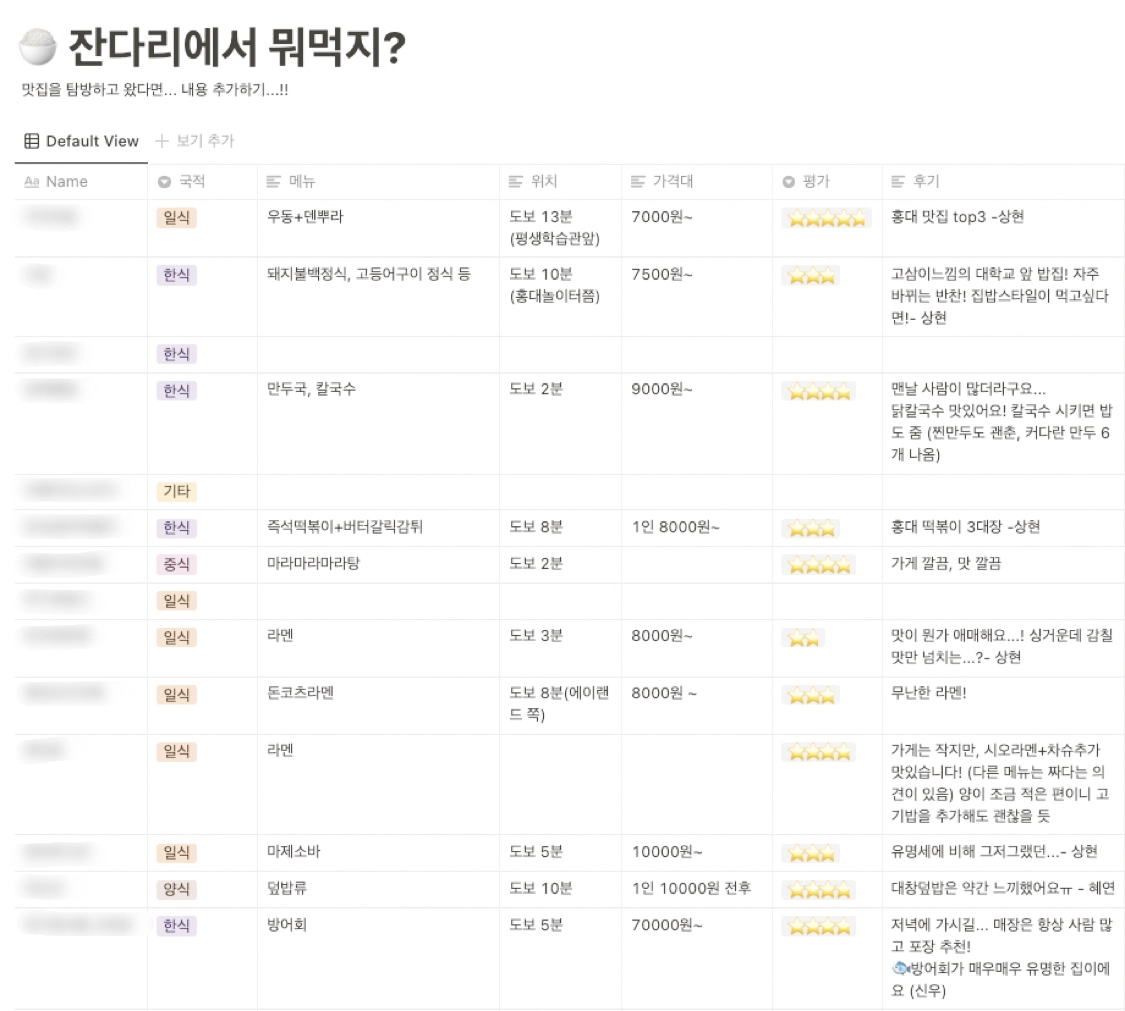 맛집은 Notion에 기록해두고, 매일 먹고싶은 메뉴를 골라서 팀원들과 함께 먹으러가요