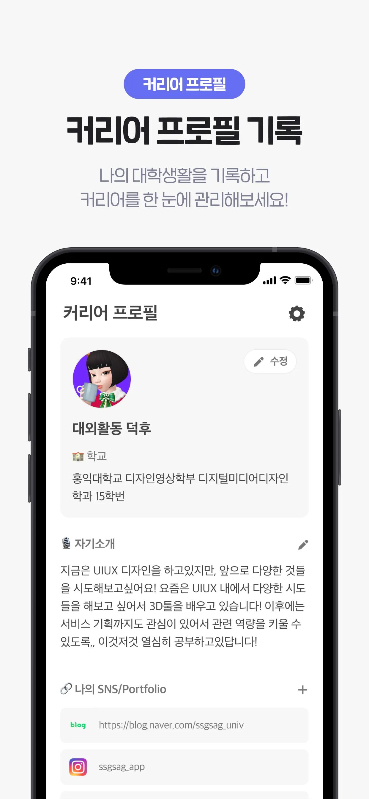앞으로는 대학교 신입생부터 사회초년생이 되기까지의 성장 과정을 기록하고 커리어의 Next step을 연결하는데 도움을 주는 대학생 커리어 성장 플랫폼 으로 확장해 나아가려고 합니다.